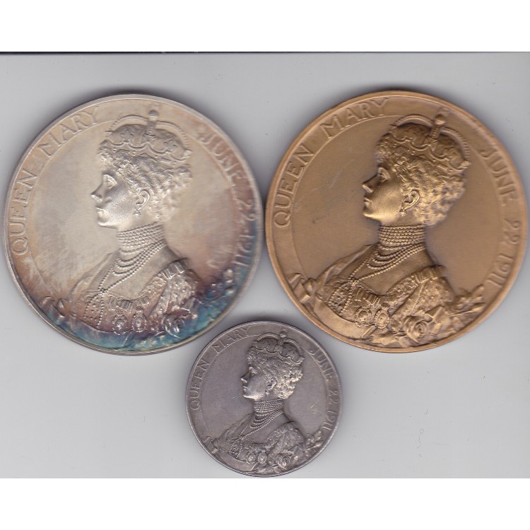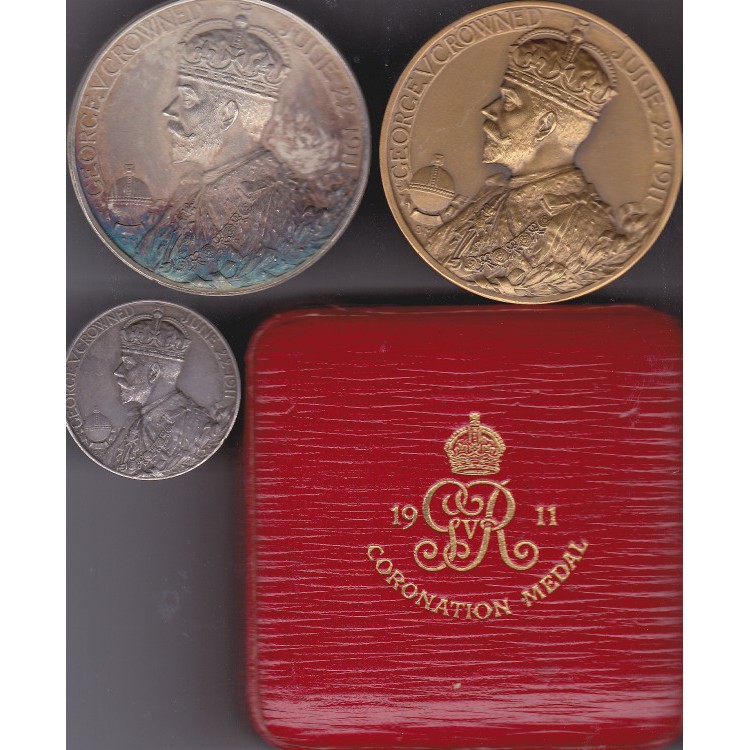 1911 год. Коронация Георга V . Официальные коронационные медали. Коронация Георга V проходила в Вестминстерском Аббатстве 22 июня 1911 года в присутствии 7000 гостей. Коронацию проводил архиепископ Йоркский который выступил с подобающей проповедью. Затем Король и Королева вернулись Букингемский дворец и вышли на балкон. Их приветствовали многотысячная толпа, собравшаяся на площади у дворца. Эти официальные коронационные медали чеканились на Королевском монетном дворе до конца 1912 года. Видимых отличий в медалях, изготовленных в 1911 и 1912 годах нет. Данные медали продавались только в главном офисе Банка Англии, в Шотландии – в Банке Шотландии и в Ирландии – в Банке Ирландии. В количестве и по цене: Большие золотые (51 мм): 225 из них (1911г. – 201, 1912г. – 24), цена – 13 фунтов Малые золотые (30 мм): 719 из них (1911г. – 672, 1912г. – 47), цена – 2 фунта 12 шиллингов и 6 пенсов Большие серебряные (51 мм): 2117 из них (1911г. – 1852, 1912г. – 265), цена – 10 шиллингов Малые серебряные (30 мм): 25241 из них (1911г. – 17800, 1912г. – 7441), цена – 1 шиллинг Бронзовые (51 мм): 6253 из них (1911г. – 5220, 1912г. – 1033), цена – 3 шиллинга В 1913 году была отчеканена по одной золотой и бронзовой медали экстра размера, до сих пор не известно для какого случая это было сделано. Поверхность всех этих медалей полуматовая, но существует две большие золотые медали поверхность которых имеет «бриллиантовое поле» а легенда вокруг портретов более глубоко вырезанная. Одна из них хранится в Королевской коллекции, вторая принадлежала королю Егита - Фаруку была продана на аукционе в октябре и1991 года в частную коллекцию. Автор медали B. Mackennal изготовлена на Королевском монетном дворе (Royal Mint) Аверс: коронованный бюст короля Георга V с шаром, повернутый налево. Легенда: GEORGE V CROWNED JUNE 22 1911. Под шаром – в м Реверс: коронованный бюст Королевы Марии, повернутый налево. Легенда: QUEEN MARY JUNE 22 1911 Большая серебряная: серебро, вес 86,4 грамм, диаметр 51 мм. Тираж - 2117 шт. (BHM 4022, Eimer 1922а). Большая бронзовая: бронза, вес 78,17 грамм, диаметр 51 мм. Тираж - 6253 шт. (BHM 4022, Eimer 1922а).