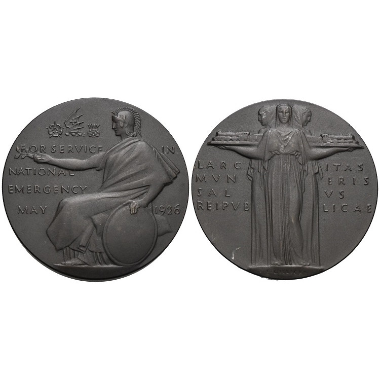 Эта медаль официально чеканилась Королевским монетным двором и вручалась от имени Лондонской, Мидлэндовской и Шотландской железнодорожной компании работникам компании. Эта медаль вручалась в коробке с благодарственным письмом. Аверс: Британия сидит в шлеме, одна рука опирается на щит, другая вытянута с лавровой ветвью. Сверху эмблемы Лондонской, Миндлэндовской и Шотландской железнодорожной компании между розой и трилистником. Легенда:: FOR SERVICE IN NATIONAL EMERGENCY MAY 1926 Реверс: Три женские фигуры стоят спиной друг к другу, два локомотива на ладонях. Легенда: LARGITAS MUNERIS SALUS REIPUBLICAE (от грандиозных задач зависит благополучие страны). Медь, автор E.Gillick, вес 61,62 грамм, диаметр 51 мм. Тираж 7750 шт. (BHM 4210, Eimer 2003). Эта медаль идет в коробке выпуска. (vea 544) |
