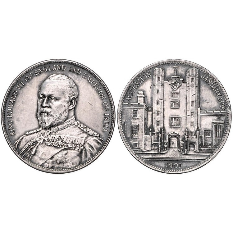1901 год. Вступление на престол короля Эдуарда VII(1902-1910) – в день смерти монарха сразу объявлялось имя его наследника - будущего Короля (Королевы) и начинались приготовления к его официальной коронации которые могли продолжаться продолжительное время. Так Эдуард VII был объявлен Королем 23 января 1901 года (в день смерти его матери - Королевы Виктории), а его коронация состоялась лишь 9 августа 1902 года. Аверс: Бюст Короля Эдуарда VII в парадном мундире повернутый на 3/4 налево. Легенда: KING EDWARD VII OF ENGLAND AND EMEROR OF INDIA Реверс: фасад Дворца St. James's (официальная резиденция монарха в Лондоне). Легенда: ACCESSION JANUARY 23rd. Внизу - 1901 серебро, автор - by Messrs Lauer, вес 19 грамм, диаметр 35,4 мм. Тираж- экз. (BHM -, Eimer 1856). (moller 669)